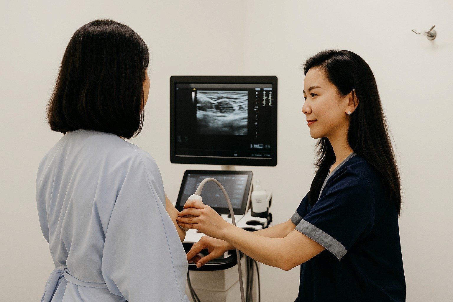 Breast ultrasound provides real-time imaging with sound waves. It is painless, non-invasive, and especially helpful for dense breast tissue. Used alongside mammography, it improves accuracy by distinguishing solid masses from cysts.